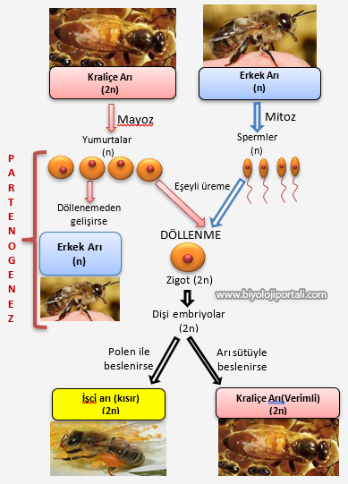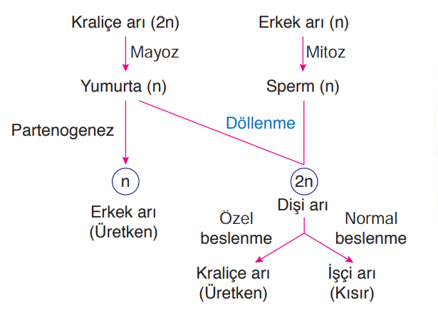 Kraliçe arı 2n kromozomlu olup üretkendir, mayoz bölünmeyle n kromozomlu yumurtaları üretir. Kovandaki en iri, en gösterişli arı, kraliçe arıdır. İşçi arılar 2n kromozomludur ancak üreme yetenekleri körelmiş, kısır bireylerdir. Küçük vücutlu olan bu arılar, balın üretimi, larvaların beslenmesi ve kovanın bakımından sorumludur. Erkek arılar döllenmemiş yumurtanın gelişmesiyle yani partenogenez ile oluşur. Bunlar sperm üretiminden sorumlu, n kromozomlu bireylerdir. Spermlerini mitoz bölünmeyle üretirler.