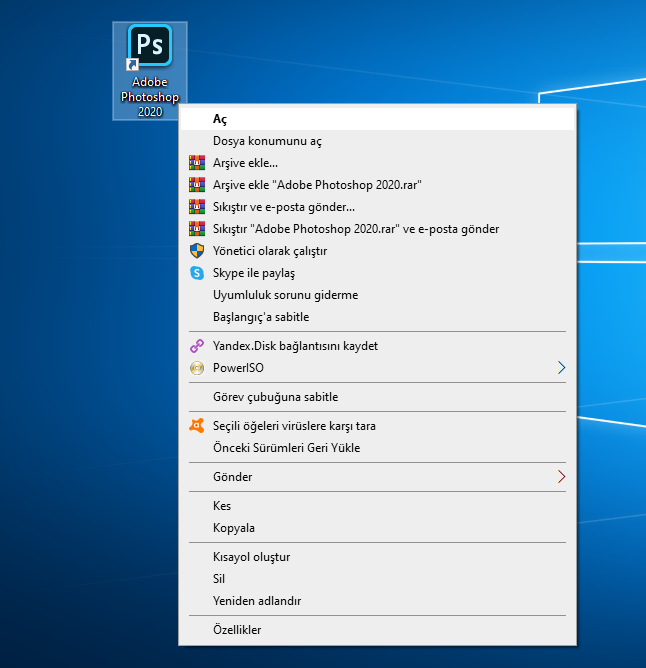 Bu yöntemde Photoshop simgesinin üzerini sağ tıklıyoruz. Gelen panelde “Aç” seçeneğini tıklamadan klavyeden “SHIFT+CTRL+ALT” tuşuna basıyoruz ve “Aç” diyoruz. Böylece karşımıza “Delete the Adobe Photoshop Settings File?” sorusu gelecek. Yes dediğinizde Photoshop programı tamamen sıfırlanmış olacaktır.