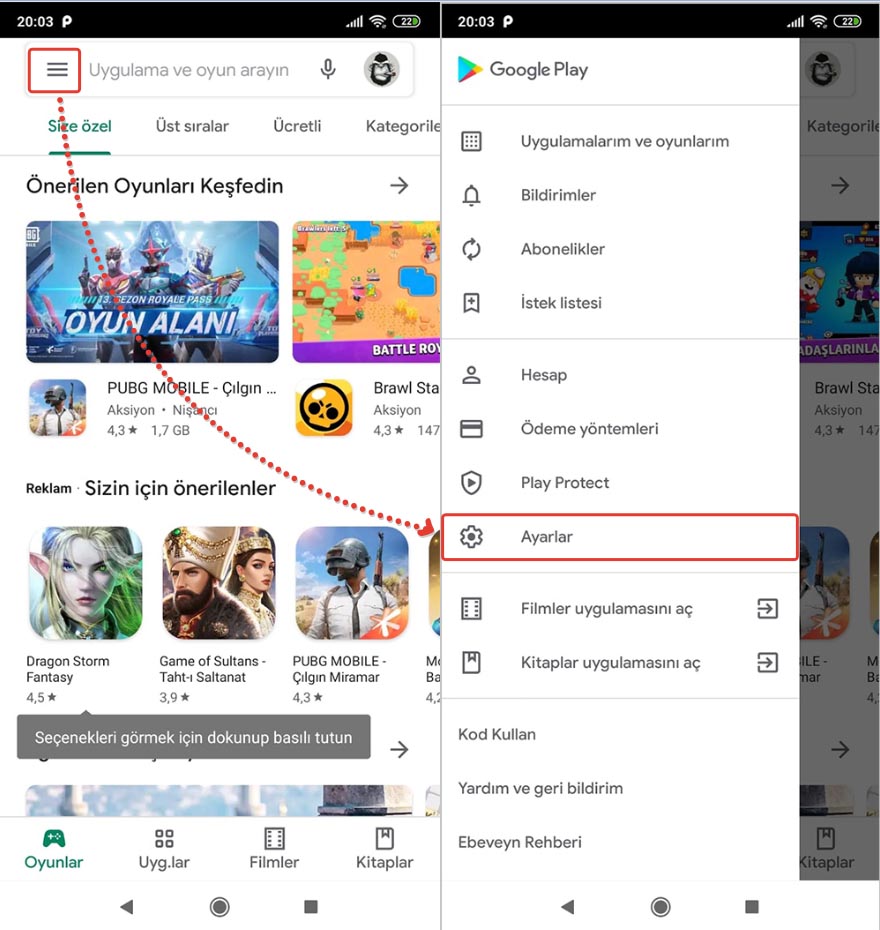 Google Play Store’da arama geçmişiniz temizlemek için öncelikle Play Store uygulamamıza gidiyoruz. Uygulamadan sol üst kısımda bulunan yatay üç çizgi simgesine klikliyoruz ve buradan Ayarlar yazan yeri seçiyoruz.