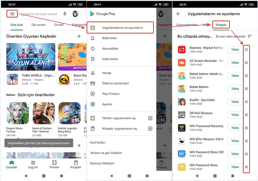 Ayrıca dilerseniz uygulamadan sol üst kısımda bulunan yatay üç çizgi simgesine klikledikten sonra gelen panelden “Uygulamalarım ve oyunlarımı” seçerek daha önce yükleyipte kaldırmış olduğunuz oyun ve uygulamaları “kitaplık” kısmından temizleyebilirsiniz.