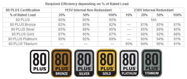 Güç kaynaklarında ilk dikkat çeken özellik kuşkusuz 2007 yılından itibaren etiketlere yansıyan 80 Plus sertifikası. Artık bu olmazsa olmazlardan. 80 Plus etiketi aslında verimliliği simgeleyen bir değer. Üzerinde 80 Plus değeri bulunan bir güç kaynağı %80 verimlilikle çalışıyor demektir. 80 Plus etiketine ek olarak sırasıyla 80 Plus, 80 Plus Bronze, 80 Plus Silver, 80 Plus Gold, 80 Plus Titanyum şeklinde verimlilik değeri yükseliyor. Şu hatırlatmadan geçmeyelim. %100 Verimlilik diye bir şey günümüz teknolojisi için pek mümkün değil. Bazı firmalar bu şekilde değerler veriyorlar ancak bunları neye dayanarak verdiklerini bilmiyorum. Şu an için sadece %90 verimlik söz konusu. Hemen aşağıda 80 Plus ile ilgili tabloyu inceleyebilir veya daha detaylı bilgiye buradan ulaşabilirsiniz.