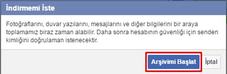 4- “Fotoğraflarını, duvar yazılarını, mesajlarını ve diğer bilgilerini bir araya toplamamız biraz zaman alabilir. Daha sonra hesabının güvenliği için senden kimliğini doğrulaman istenecektir.” seçeneği çıkacak. Arşivimi Başlat diyoruz.