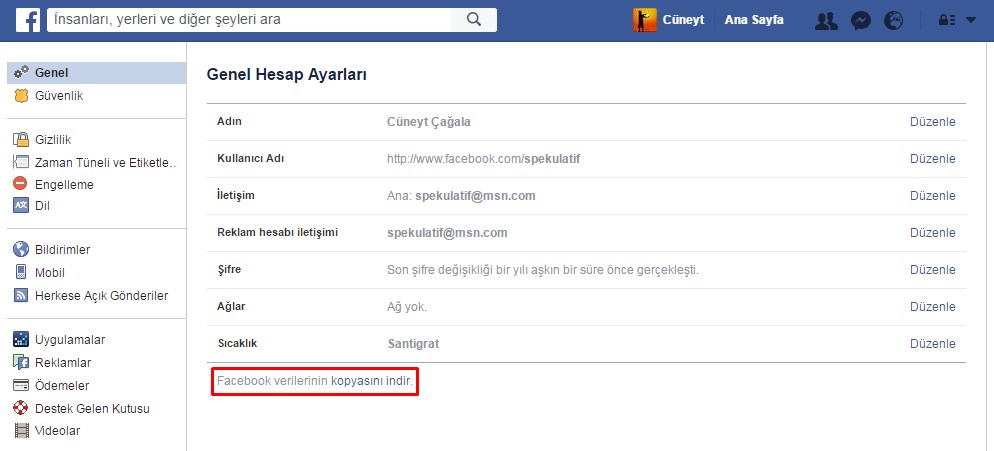 2- Açılan pencerede en altta bulunan “Facebook verilerinin kopyasını indir” kısmını klikleyin.