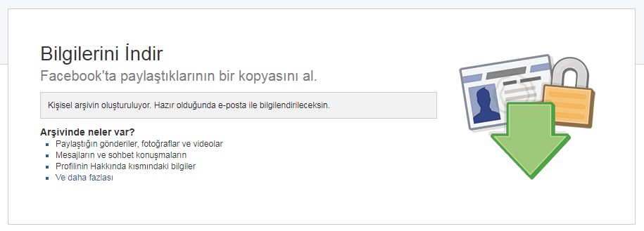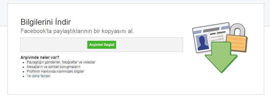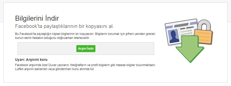 6- Genellikle e-posta geç geliyor yada hiç gelmiyor! Bu nedenle maximum 20-25 dk bekleyin ve tekrar ilk sırada yaptığımız gibi Ayarlar kısmından “Facebook verilerinin kopyasını indir” seçeneğini seçin. Karşınıza yukarıdaki pencereden farklı olarak ARŞİVİ İNDİR seçeneği çıkacak. Bunu seçtiğinizde bilgisayarınıza RAR’lanmış halde bir veri dosyası inecek.