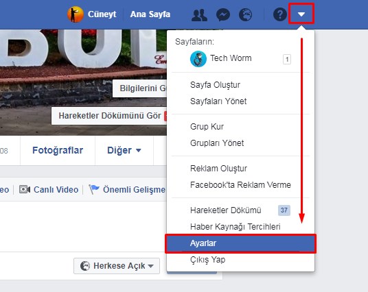 1- Facebok profil sayfasından sağ-üste bulunan ikonu klikleyerek AYARLAR seçeneğini tıklatın.