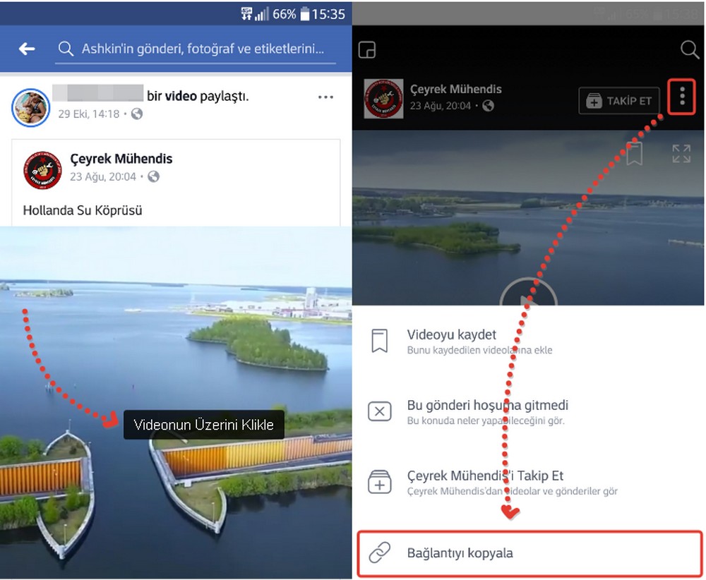 Öncelikle telefondaki uygulamadan herhangi bir videoyu indirmek için videonun üzerine klikliyoruz. Böylece videoyu paylaşan sayfaya gidiyoruz. Videonun paylaşıldığı sayfanın sağ üst köşesinde bulunan yatay üç nokta simgesine klikleyip “Bağlantıyı Kopyala” diyoruz.