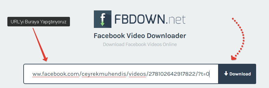 2- Burada (https://www.fbdown.net/) bulunan siteye gidip açılan sayfadaki boşluğa sağ klikleyip video URL’sini buraya yapıştıralım ve “Download” diyelim.