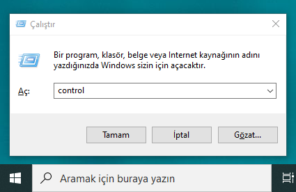 İlk olarak klavyeden Windows + R tuşuna basıyoruz. Gelen küçük panele control yazdıktan sonra “Enter” yapıyoruz. Böylece karşımızda “Denetim Masası” penceresi gelmiş olacaktır.