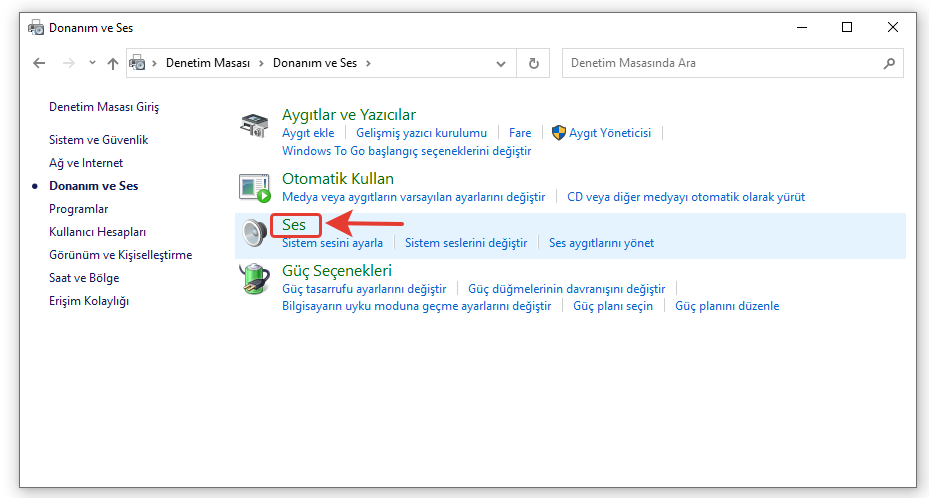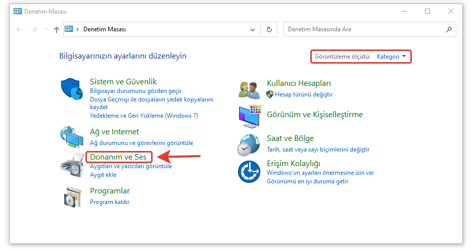 Denetim Masası penceresi geldikten sonra “Donanım ve Ses” seçeneğini seçiyoruz.