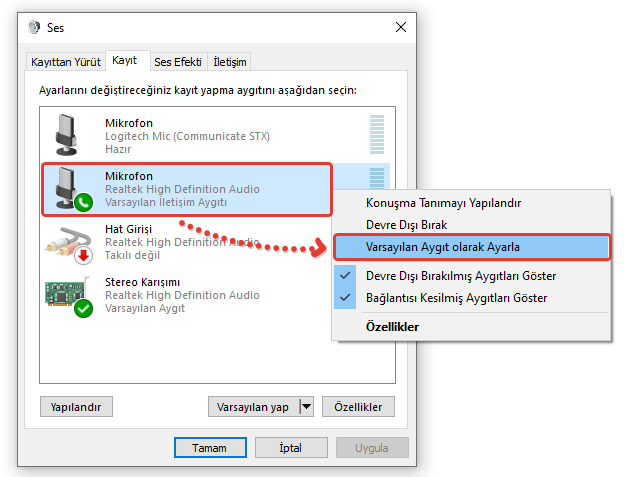 Son olarak bu işlemi yaptığınızda sadece hoparlörden çıkan sesi kayıt edersiniz. Mikrofonunuz devre dışı bırakıldığı için konuşmalarınız kayıt edilmez. Kayıt işlemi bittikten sonra mikrofonunuzu tekrar kullanabilmek (eski haline getirmek) için “ses penceresi/paneli” kısmında mikrofonunuzun üzerini sağ tıklayıp “Varsayılan Aygıt Olarak Ayarla” diyoruz.