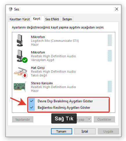 Böylece karşımıza ses penceresi/paneli gelmiş olacaktır. Burada kayıt sekmesini seçiyoruz ve ardından boşlukta sağ tıklayıp aşağıdaki gibi “Devre Dışı Bırakılmış Aygıtları Göster” ve “Bağlantısı Kesilmiş Aygıtları Göster” seçenekleri seçili hale getiriyoruz.