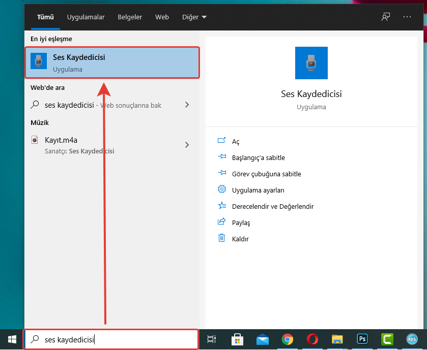 Windows 8 veya Windows 10 işletim sistemleri için arama kısmına “Ses Kaydedicisi” yazarak ses kaydetme uygulamasını açıyoruz. Windows 7 kullananlar için Başlat | Tüm Programlar | Donatılar | Ses Kaydedicisi kısmına giderek ses kaydetme uygulamasını açıyoruz.