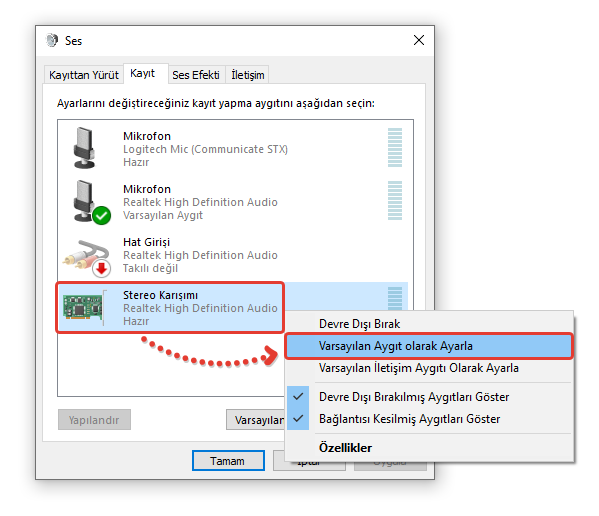 Stereo Karışımı yazan sekmenin üzerini sağ klikleyip “Varsayılan Aygıt Olarak Ayarla” diyoruz. Bu kısımdaki işlemimiz tamamlandı.