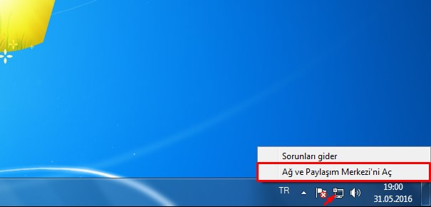 1- Bilgisayarınızın sağ-alt köşesinde bulunan bağlantı simgesini sağ klikleyin ve açılan panelde “Ağ ve Paylaşım Merkezini Aç” seçeneğini seçin.