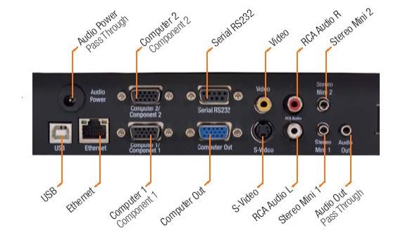 Bir projeksiyon cihazında bilgisayara bağlanması için VGA çıkışı, televizyon ya da kamera gibi aygıtlara bağlamak için S-Video çıkışı, ses çıkışları, USB cihaz bağlamak için USB bağlantı noktası, network ortamından cihaza erişim için ethernet çıkışı, dijital kamera, fotoğraf makinası gibi cihazların bağlanması için RCA Audio / Video çıkışları gibi pek çok çıkış bulunmaktadır.