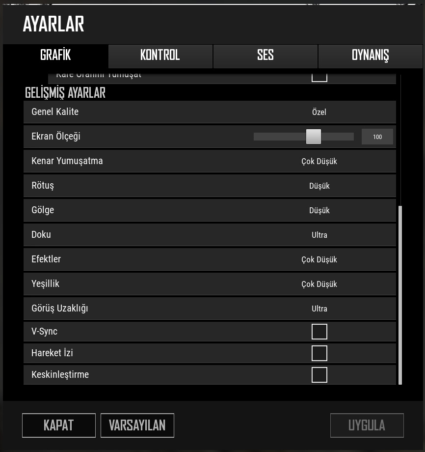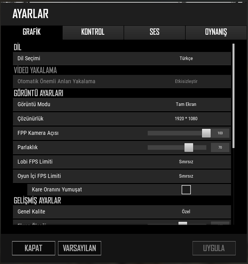 Dünyanın en çok oynan oyunları arasında gösterilen PUBG’de iyi bir avcı olmak için bazı püf noktalar bulunuyor. Bu püf noktalardan bir tanesi kuşkusuz grafik seçeneklerinin optimum bir şekilde ayarlanmasından geçiyor. Default yani varsayılan olarak grafik seçenekleri en uygun görüntü kalitesini sunacak şekilde geliyor. Ancak bu kez yüksek bir grafik yoğunluğu ile karşı karşıya kalıyoruz. Rakibiniz bazen yanı-başınızdan hoplaya-zıplaya geçtiği halde fark etmeyebiliyorsunuz. Eğer grafik ayarlarını aşağıda gösterdiğim şekilde düzenlerseniz hem görsel açıdan sizi yormayacak bir görüntüye sahip olacak hem size en uzak noktada bulunan rakibinizin hareketleri fark edecek hem de iyi bir FPS değeri elde edeceksiniz. Ayrıca aşağıdaki ayarlar sizde İngilizce ise kısa süreliğine Türkçe yapıp tekrar varsayılan dil seçeneğine dönebilirsiniz.