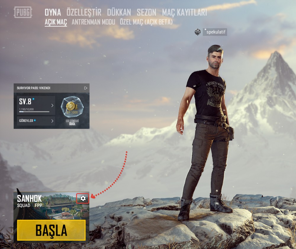 PUBG Oyununda Solo, Duo, Squad ve 1-Kişilik Squad olmak üzere 4 farklı oyun modu bulunuyor. Modları belirlemek için oyunun giriş sayfasında aşağıdaki fotoğrafta görülen ayarlar seçeneğine gitmek yeterlidir.