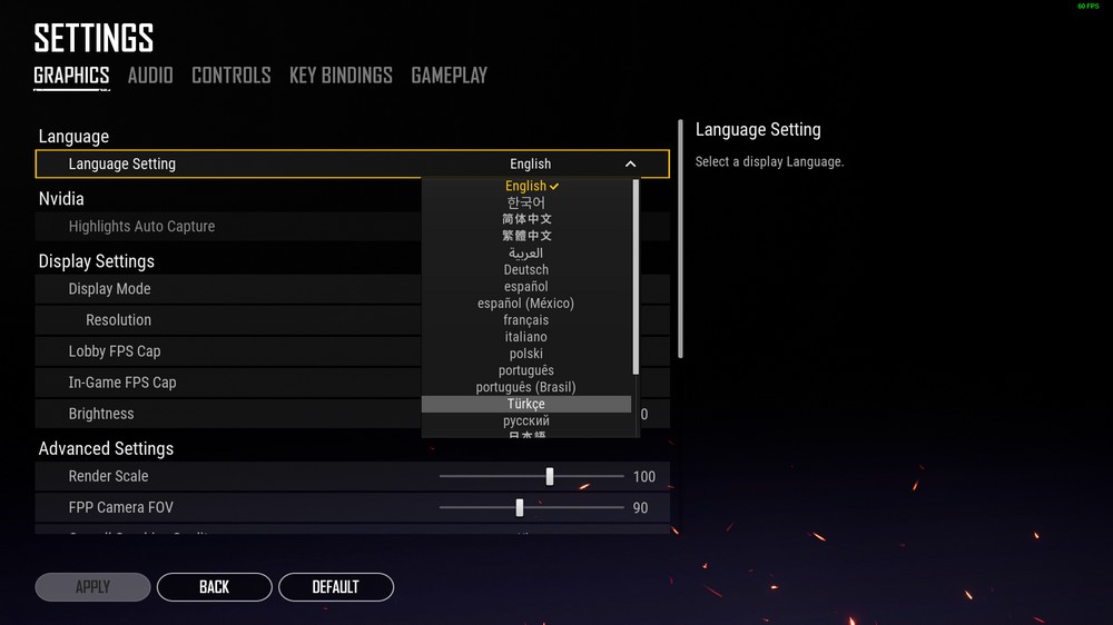 Gelen pencereden Graphics (Grafik) seçeneğininin altında bulunan Language Setting sekmesine gelip karşısındaki Türkçe dil seçeneğini seçiyoruz ve alttaki Apply butonunu klikliyoruz.