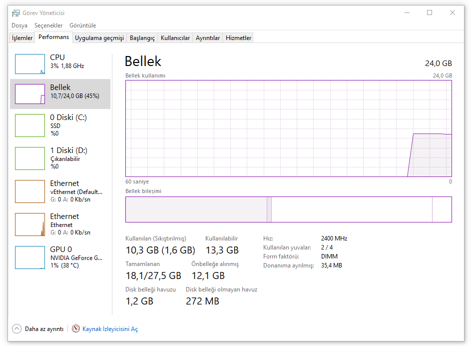 Farklı bir şekilde “Görev Yöneticisinden” bilgisayarınızın sahip olduğu RAM miktarını -yani kapasitesini- hızlı bir şekilde öğrenebilirsiniz. Bunun için “Görev Çubuğu” üzerine sağ tıklayıp “Görev Yöneticisi” seçin; ardından “Performans” sekmesine gelerek “Bellek” yazan yeri tıklayın. Burada; bilgisayarınıza takılı RAM’in miktarı, hızı (frekansı), kullanılan yuva sayısı, form faktörü ve anlık kullanılan bellek miktarı gibi birçok bilgiye ulaşabilirsiniz.