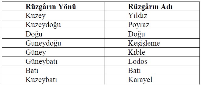 Yönlerine göre rüzgârlar bir tablo halinde verilecek olursa: