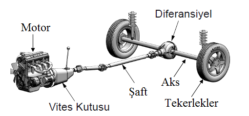 Şekil’de gösterilen arkadan itişli bir taşıtta hareketin vites kutusundan diferansiyele, şaft vasıtasıyla aktarılması görülmektedir.
