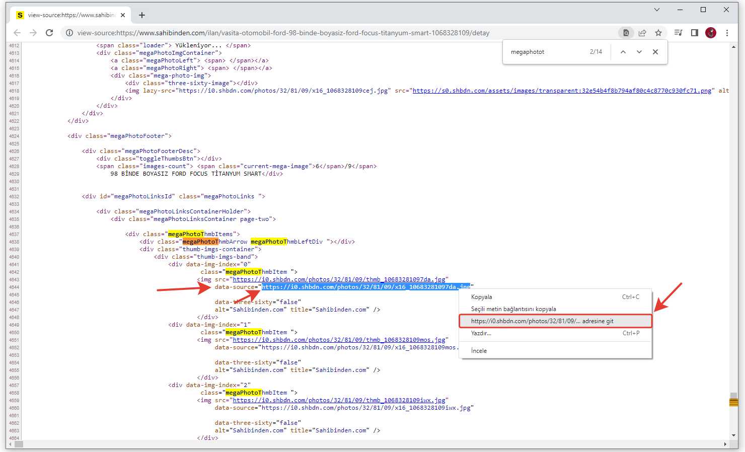 Karşımıza gelen arama penceresine “megaphotot” şeklinde yazdığımızda bu bizi ekrandaki ilan için yüklenen resim/fotoğraf bağlantılarına götürecektir.