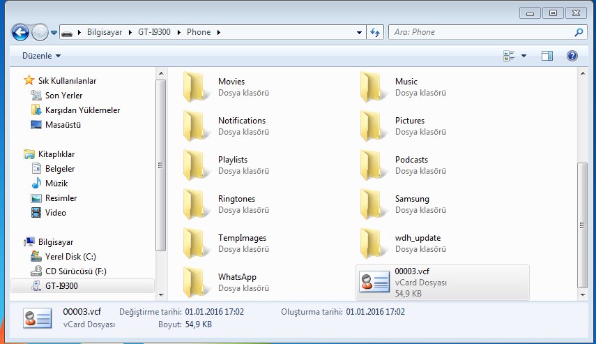 Peki rehberim nereye yedeklendi. Bilgisayarınıza USB Kablosu aracılığı ile telefonunuzu bağlayan telefonunuzun belleğine girdiğiniz anda karşınıza çıkacaktır. Aşağıdaki gibi…