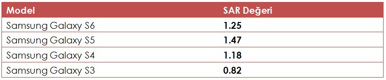 SAR Değeri en düşük ilk 5 telefona baktığımızda Verkool Vortext RS90 0.18 W/kg , Samsung Galaxy Note 0.19 W/kg , ZTE Nubia 5 0.225 W/kg , Samsung Galaxy Note 2 0.28 W/kg ,Samsung Galaxy Mega 0.321 W/kg olduğunu görmekteyiz. SAR Değeri en yüksek ilk 5 telefon ise Motorola Droid Maxx 1.54 W/kg, Motorola Droid Ultra 1.54 W/kg, Alcatel One Touch Evolve 1.49 W/kg, Huawei Vitria 1.49 W/kg, Kyocera Hydro Edge 1.48W/kg olduğu görülmektedir.