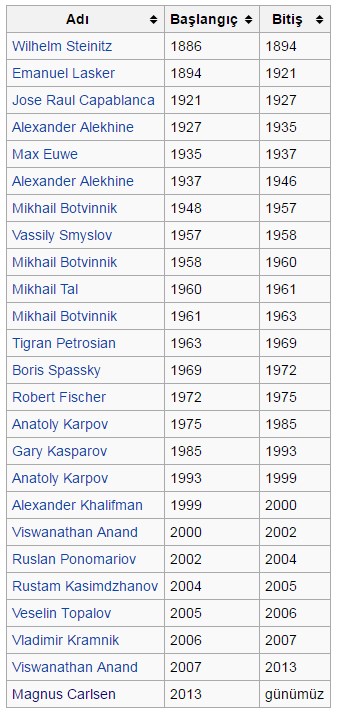 Dünya Satranç Şampiyonu: Magnus Carlsen (30 Kasım 1990) Norveçli satranç büyükustası. FIDE sıralamasında 1. sıradadır ve günümüzün klasik, hızlı ve yıldırım satranç şampiyonudur. En yüksek FIDE ELO’su 2882’dir ve bu derece bir rekordur. Carlsen Popüler kültürde Satrancın Mozart’ı(The Mozart of Chess) olarak adlandırılır.