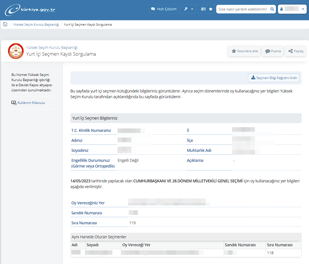 Nerede ve hangi sandıkta oy kullanacağınız, adresinize gönderilen seçmen bilgi kağıdında yer almaktadır. Eğer seçmen bilgi kağıdınız elinize ulaşmadıysa; Seçmen Portalı, e-Devlet kapısı veya Mobil Uygulamadan kendinizin ve sizinle aynı hanede oturan yakınlarınızın oy kullanacağı yer ve sandık numarasını öğrenebilirsiniz.