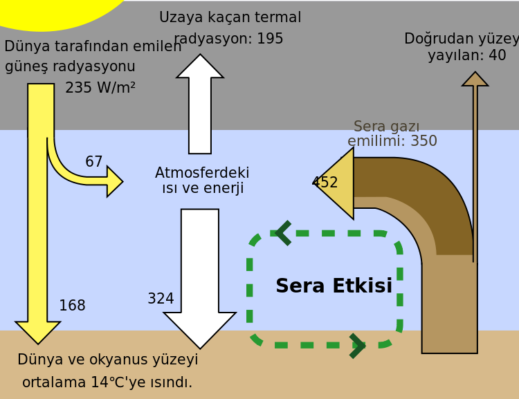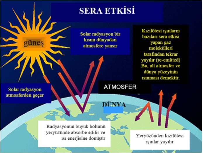 Dünya, üzerine düşen güneş ışınlarından çok, dünyadan yansıyan güneş ışınlarıyla ısınır. Bu yansıyan ışınlar başta karbondioksit, metan ve su buharı olmak üzere atmosferde bulunan gazlar tarafından tutulur, böylece dünya ısınır. Işınların bu gazlar tarafından tutulmasına sera etkisi denir. Atmosferde bu gazların miktarının artması Yerküre’de ısınmayı büyük oranda artırır.