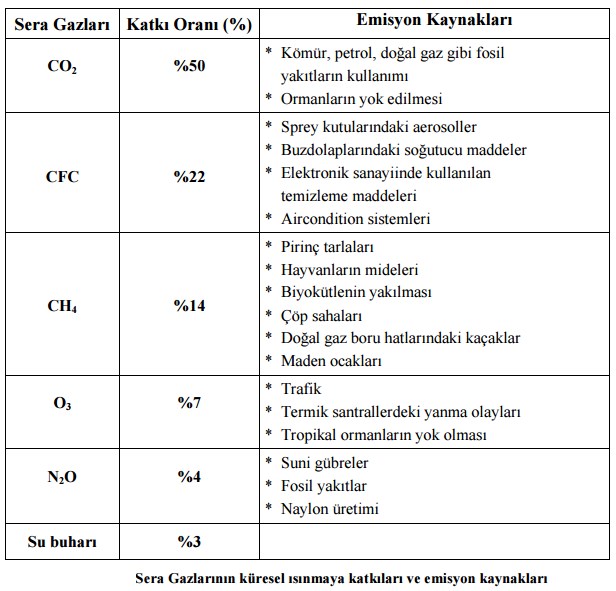 Endüstri devriminin başlamasından, özellikle 2. Dünya Savaşından sonra, insan aktivitesi sera gazlarının miktarını her geçen yıl arttırarak günümüzde tehlikeli oranlara ulaştırmıştır. Sera gazlarının en önemlisi karbondioksit gazıdır. Karbondioksit düzeyi, l9.Yüzyıl değerlerinin %25’i oranında artmıştır. ġu anda tahminen 5-6 milyar tonu aşan karbondioksit her yıl atmosfere yayılmaktadır. Gelecek yüzyıl karbondioksit oranının ikiye katlanacağı ve bunun sonucunda ortalama sıcaklıkların 1,5°C ile 4,5°C artacağı düşünülmektedir. Bu ısınma ile, dünya iklim sisteminde köklü değişimler olacağı, dünyanın bazı bölgelerinde kasırgalar, seller ve taşkınlar gibi hava olaylarının şiddeti ve sıklığı artarken, bazı bölgelerde de uzun süreli, şiddetli kuraklıklar ve çölleşme olayları etkili olabileceği düşünülmektedir. Sıcaklık artışının kışları, yazlara göre birkaç derece fazla olması beklenmektedir.