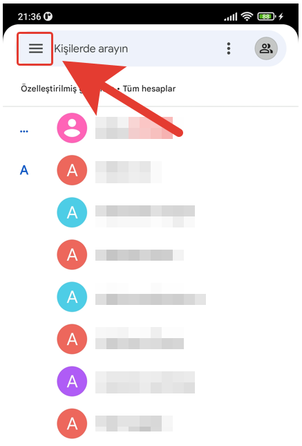 Kişiler uygulamasını yükleyip açtıktan sonra (hemen alttaki görseldeki gibi) sol üst kısımdaki yatay üç çizgi simgesine tıklayalım.