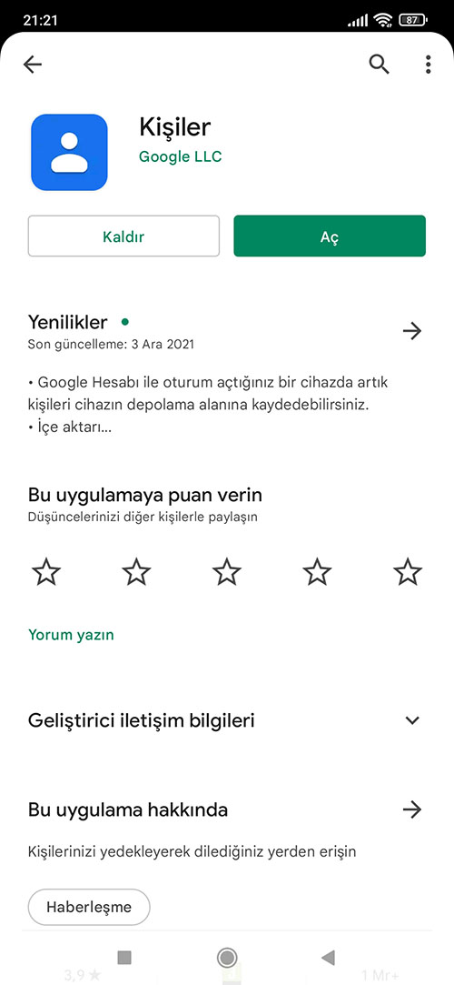 Öncelikle telefon rehberiniz silindiyse geri getirmek için ilk yapacağınız işlem Play Store’u açıp “Kişiler” uygulamasını yüklemek. Aslında bu uygulama birçok telefonda mevcut. Eğer sizde bu uygulamanın yüklü olup olmadığını bilmiyorsanız hemen Play Store’u açalım ve buraya “kişiler” yazıp arattıralım. Karşınızda yükle seçeneği geldiyse “uygulama” telefonunuzda yüklü değil demektir ve yüklemeniz gerekiyor. Eğer sadece “aç” seçeneği varsa o zaman uygulama telefonunuzda yüklü demektir. Yapmanız gereken sadece “aç” demek.