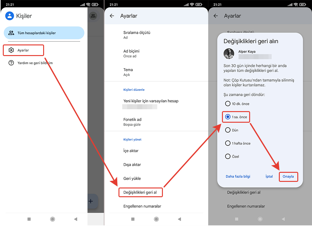 Buradan “Ayarları” seçelim. Gelen pencereden “Değişiklikleri Geri Al” diyelim ve rehberin silindiği zamandan önceki bir zamanı seçip “ONAYLA” diyelim. Bir kaç dakika içerisinde rehberiniz geri gelecektir.