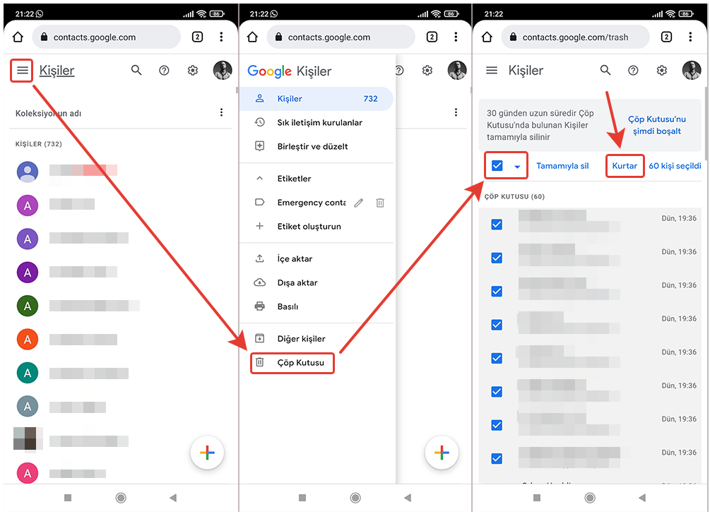 İkinci yöntemimizde ise telefonumuzdan herhangi bir tarayıcıyı açalım ve arama kısmına contacts.google.com şekline yazalım. Ardından telefonumuz Ayarlar | Google sekmesinde bulunan gmail hesabımızla buraya giriş yapalım. Giriş yaptıktan sonra sol üst kısımdaki yatay üç çizgi simgesine tıklayalım ve buradan “Çöp Kutusunu” seçelim. Gelen pencereden “Kişilerin Tamamını Seçili Hale” getirdikten sonra “KURTAR” diyelim. Bir kaç dakika içerisinde rehberiniz geri gelecektir.