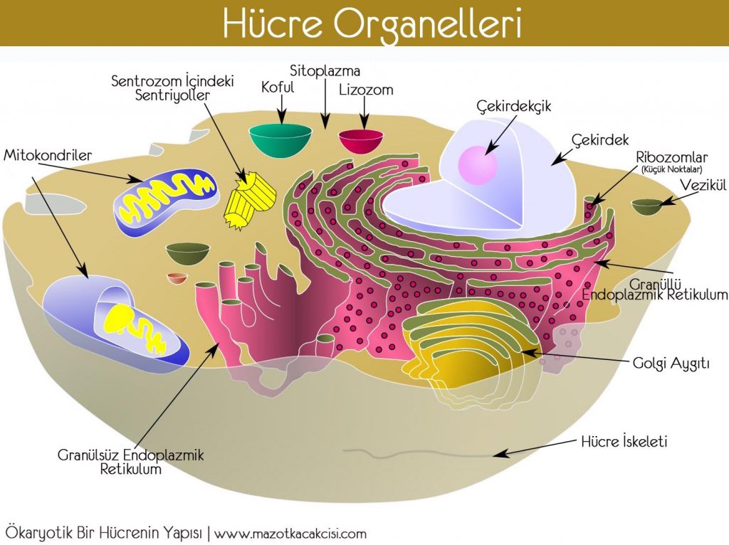 Organeller: Endoplazmik Retikulum, Mitokondri, Lizozom, Ribozom, Golgi Aygıtı, Plastitler (Kloroplast, Kromoplast, Lökoplast), Koful, Sentrozom, Peroksizom.