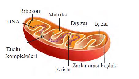 Hücrenin enerji (ATP) üretim merkezidir. Oksijenli solunum yapan ökaryotik hücrelerde bulunur. Prokaryotik hücrelerde ve memelilerin alyuvarlarında bulunmaz. Çift zarlıdır. Dış zar düz, iç zar kıvrımlıdır. Kıvrımlı bu yapıya krista denir. Krista üzerinde ETS enzimleri (enerji üretiminde görev alan enzimler) vardır. Kristadaki kıvrımlar mitokondrinin yüzeyini genişletir, böylece daha fazla ATP üretilir. Kendisine ait DNA, RNA ve ribozomu vardır. Kıvrımların arasını matriks adı verilen sıvı doldurur. DNA, RNA, ribozom ve solunum enzimleri matriks içinde yer alır. Enerji ihtiyacı fazla olan sinir, kas ve karaciğer gibi hücrelerde mitokondri sayısı diğer hücrelere göre daha fazladır. Mitokondrilerin kendilerine özgü sınırlı bilgi taşıyan DNA’sı yüzünden kendilerini eşleyebilirler. Çoğalmaları, çekirdek DNA’sının kontrolünde gerçekleşir.