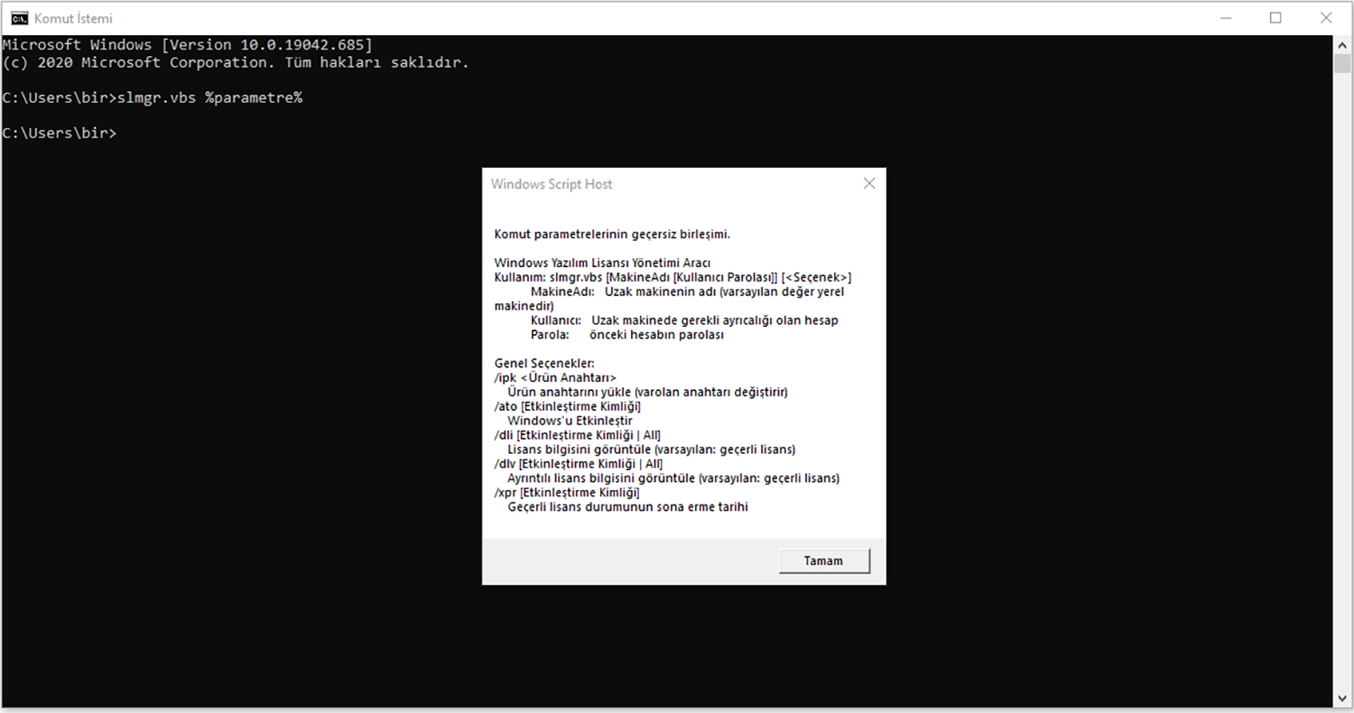 C:\Windows\System32>slmgr.vbs %parametre% olarak komutu yazdığımızda kullanabileceğimiz komutlar ekranda gösterilecektir. Tamam butonuna tıkladığımızda tüm parametreler sırayla gösterilecektir.
