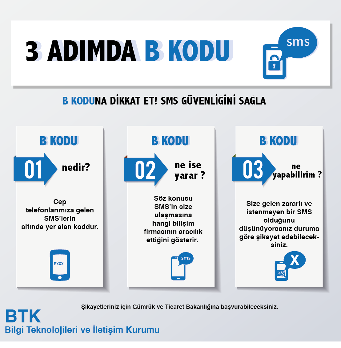 Bilgi Teknolojileri ve İletişim Kurumu (BTK) tarafından 12 Nisan 2016 tarihinde yapılan düzenleme ile, alfanümerik karakterli CLI’a (Arayan Hat Bilgisi) sahip SMS başlatan işletmeciler tarafından, SMS metninin sonuna gelecek şekilde eklenecek, haberleşmenin gizliliğine yönelik mevzuata riayet edilerek, kendilerine BTK tarafından tahsis edilen Numara Taşınabilirliği Yönlendirme Kodu’nun (B ile başlayan BXXX yapısındaki kod) eklenmesi zorunlu hale getirilmiştir. Böylece SMS’in hangi işletmeci üzerinden gönderildiği ve dolayısıyla hangi abone tarafından atıldığı tespit edilebilecektir. Yapılan düzenleme ile işletmecilere gerekli hazırlıkları yapmaları için tanınan 6 aylık süre, 11 Aralık 2016 tarihinde sona ermiş olup, alfanümerik başlıklı SMS’lerin sonundaki 4 Haneli kod, ilgili işletmeciyi tanımlamaktadır. İstenmeyen içeriklere dair Gümrük ve Ticaret Bakanlığı’na SMS’deki B Kodu, numara ve sms saati ile birlikte şikayet edilebilecek.