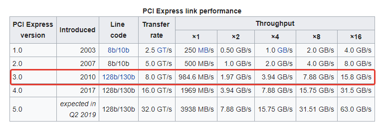 Yukarıda SATA konusunda veriyolu hızlarını vermiştik. PCIe veriyolu hızları ise aşağıdaki gibidir.