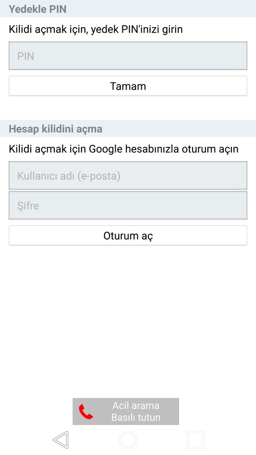 Ancak kilit blokesi gerçekleştikten sonra size acil arama ve deseni unuttunuz mu? Seçenekleri sunuluyor. Eğer deseni unuttum derseniz deseni oluştururken girdiğiniz kodu kullanarak telefonunuzu açabilirsiniz. Eğer desen kodunu hatırlamıyorsanız diğer bir seçenek olarak telefonunuzda tanımlı olan gmail kullanıcı adı ve şifresini girerek telefonunuzu açabilirsiniz.