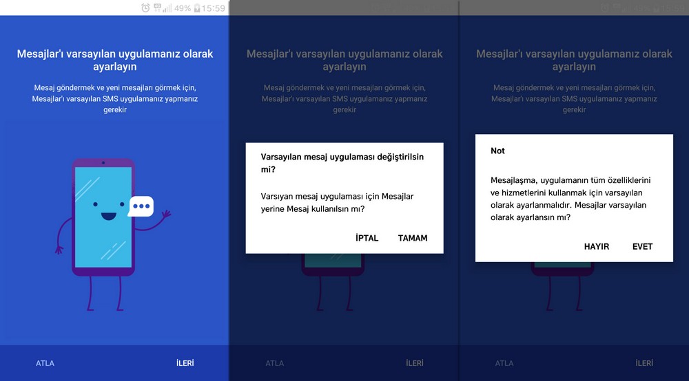 Mesajları varsayılan uygulamanız olarak ayarlayın kısmında “İleri” dediğinizde aşağıdaki gibi iki uyarı ekranına “Tamam/Evet” diyoruz. Böylece kurulum tamamlanmış oluyor.