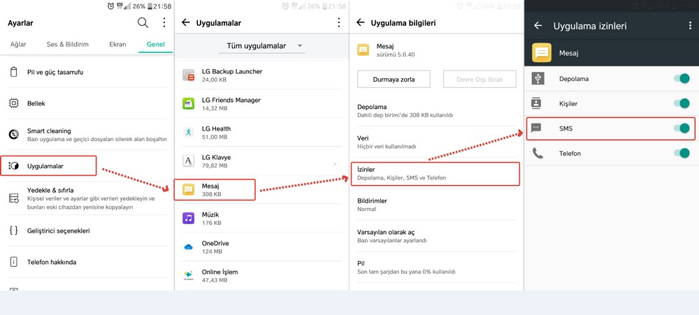 Geçenlerde bir aracın “Hasar Kaydını” sorgulamak için 5664‘e mesaj göndermek istediğimde “mesajımın gönderilmediğini” fark ettim. Tabi ilk başta hata vs. oldu diye tekrar mesajı gönderdiğimde aynı hatayı almaya devam ettim. Durum böyle olunca ilk iş müşteri hizmetlerini aramak oldu. Müşteri hizmetleri bir kaç ayar yaptı ve aşağıda fotoğraflarda gösterdiğim gibi Ayarlar > Uygulamalar > Mesajlar kısmına gelerek “İzinler” kısmında SMS seçeneğini aktif hale getirmemi ve telefonunu yeniden başlatmamı istedi.