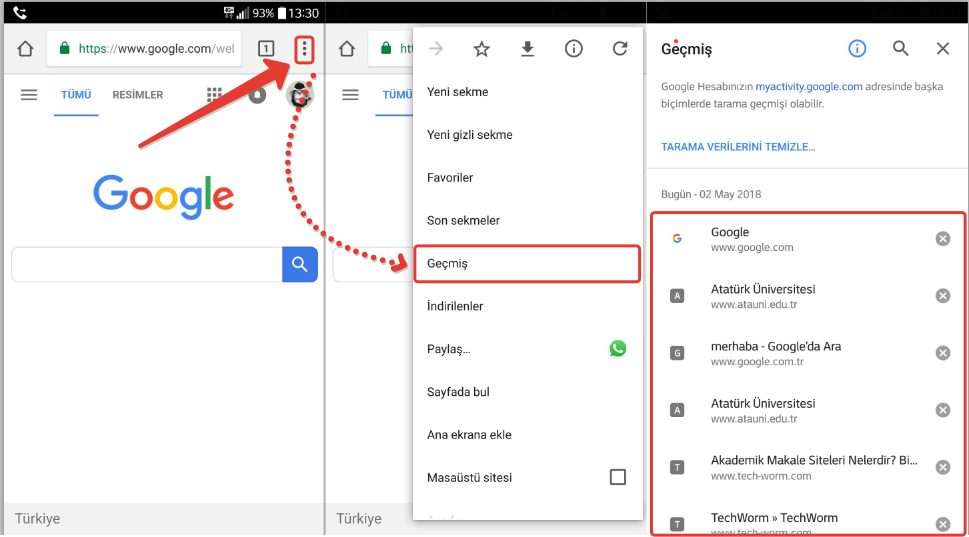 Şimdi kafanızı çok karıştırmadan aşama aşama bilgi vermeye çalışayım. Telefondan iki şekilde bilgileriniz kayıt ediliyor. Bunlardan ilki doğrudan kullandığınız tarayıcıya (Google Chrome, Safari, Opera, Mozilla vs.) kayıt ediliyor. Örneğin Google Chrome için aşağıda görüldüğü gibi tarayıcının sağ üstte buluna üç nokta işaretini klikleyip geçmiş dediğinizde girdiğiniz tüm web sitelerin kayıt edildiğini göreceksiniz.