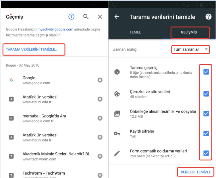 Bunu silmek için devamında tarama verilerini temizle gelişmiş, zaman aralığı tüm zamanlar ve tüm klikleri aktif/seçili hale getirip verileri temizle diyoruz. Böylece girdiğiniz tüm internet siteleri silinmiş olacak.