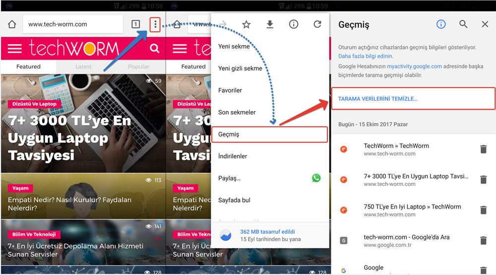 1- İlk olarak tarayıcı sayfanızı açın ve sağ üstte bulunan yatay üç nokta simgesine klikleyin ve açılan panelden GEÇMİŞ dedikten sonra TARAMA VERİLERİ TEMİZLE diyelim.