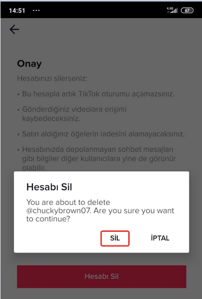 5.Adım: Bu işlemin geri dönüşü yoktur. Yayınladığınız video varsa videoları silmezseniz uygulamada kalmaya devam eder. Sohbetleriniz silinmez ve alınan bir ürün varsa geri iade edilmez.