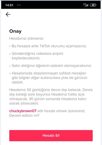 Tüm adımları takip ettikten sonra hesabınız kalıcı olarak silinmek için işleme alınacaktır. Eğer 30 gün boyunca hesabına giriş yapmazsanız TikTok hesabınız kalıcı olarak silinecektir. 30 gün içerisinde hesabınızı silme işleminden vazgeçerseniz normal bir şekilde hesabınıza giriş yapmanız yeterli olacaktır. Ancak 30 günlük süre içerisinde hesabınıza giriş yapamadığınız takdirde hesabınız kalıcı olarak silinecektir.
