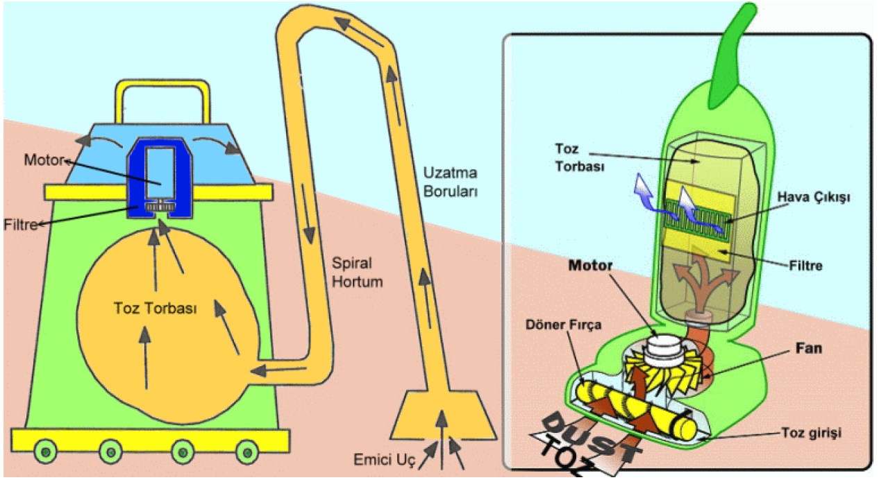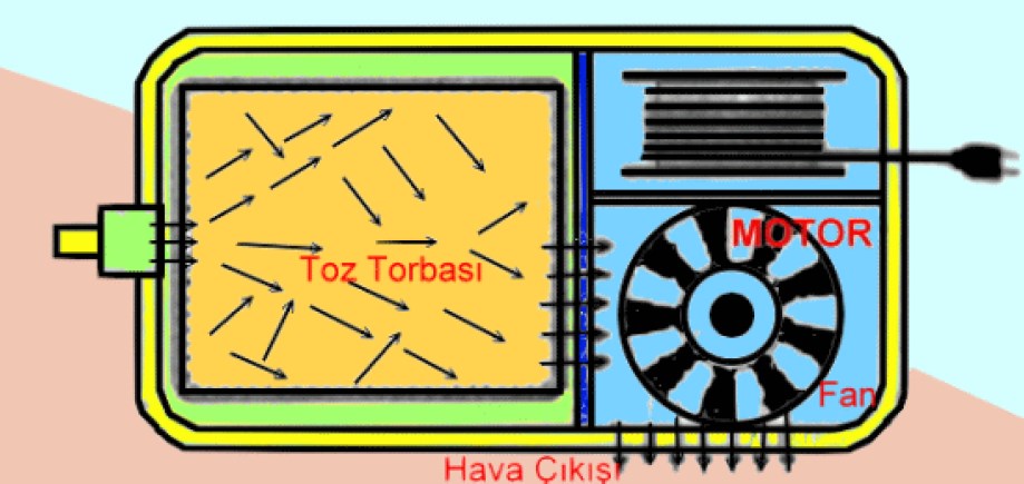 Toz Torbalı Elektrik Süpürgesi Çalışma Prensibi: Elektrik süpürgesi çalıştırıldığında, yüksek devirlerde çalışan motor ve fan yardımıyla vakum oluşturulur. Fan, süpürge içinde bulunan vakum odasına sızdırmaz bir şekilde bağlıdır. Vakum odasına bağlı emiş adaptörü yardımı ile vakum, hortum ve borunun ucuna kadar gelmektedir. Hava, emici uç uzatma borusu ve spiral hortumdan toz torbasına girer.